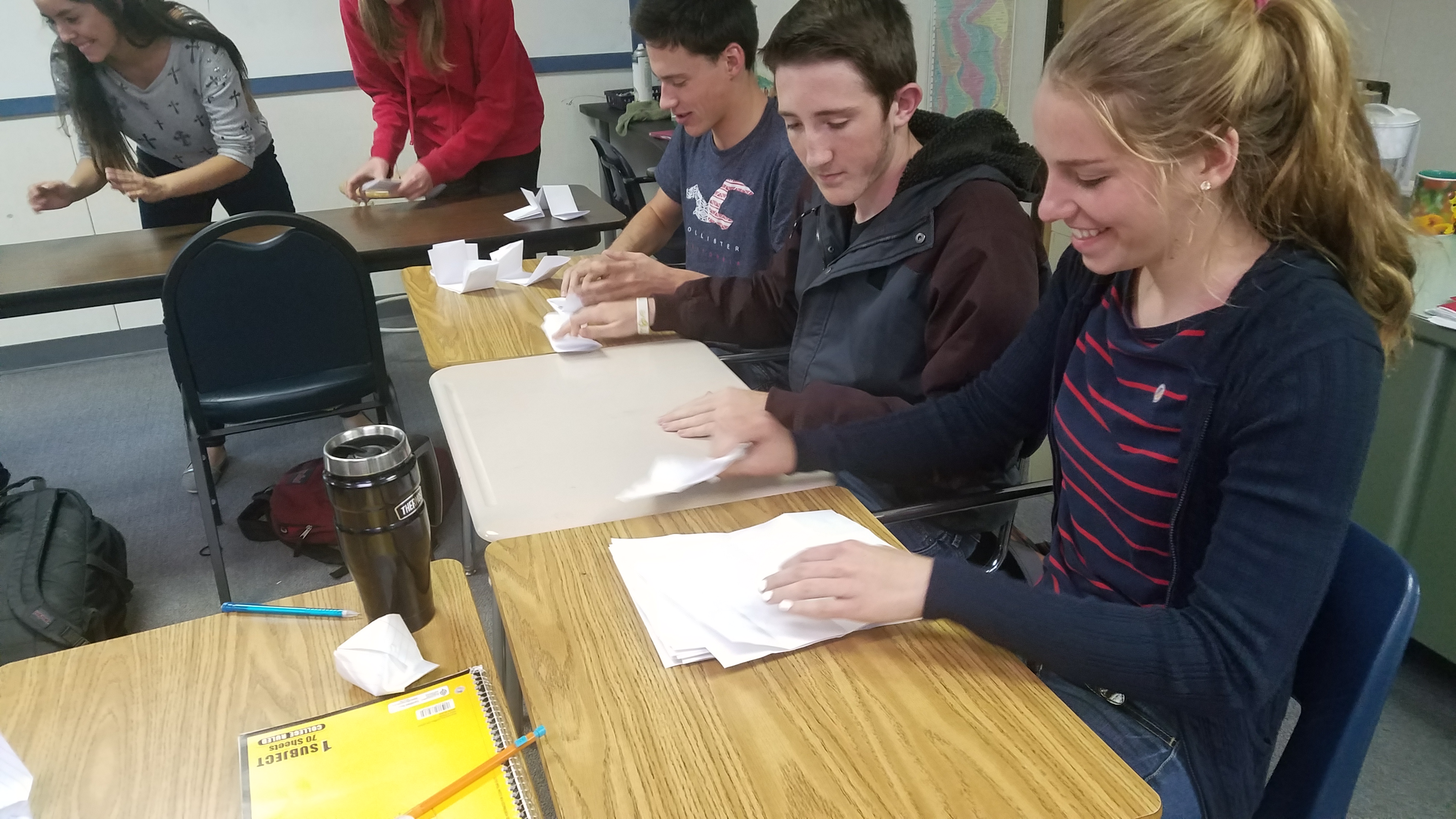 This week students have been learning about how Henry Ford put together his Model-T via mass production and the assembly line. To help them relate, students were first asked to fold as many sheets of paper as possible in one minute in an assembly line fashion, where each member of their team had one particular fold to make as the paper moved from the person before them. By the time the paper had passed through every team member, thereby reaching the end of the line, it had transformed into one, completed “widget.” Then, students were asked to fold as many sheets of paper within the same time frame and in the same folding pattern, with the only difference being that they would work individually, rather than as a team.