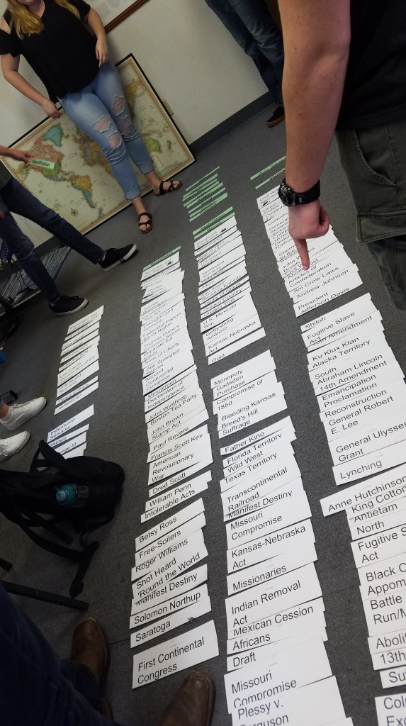 Running with this idea, I printed all of the first semester terms/themes onto card stock and then jumbled the order in which they occur in US history. Next, I asked students to work in groups to attempt to place these terms/themes into chronological order. By attempting to create their own concept web, students gained a first look at what they’ll be learning over the next few months, and I, as their teacher, gained insight as to who was already familiar with certain terms and who was not (formative assessment).