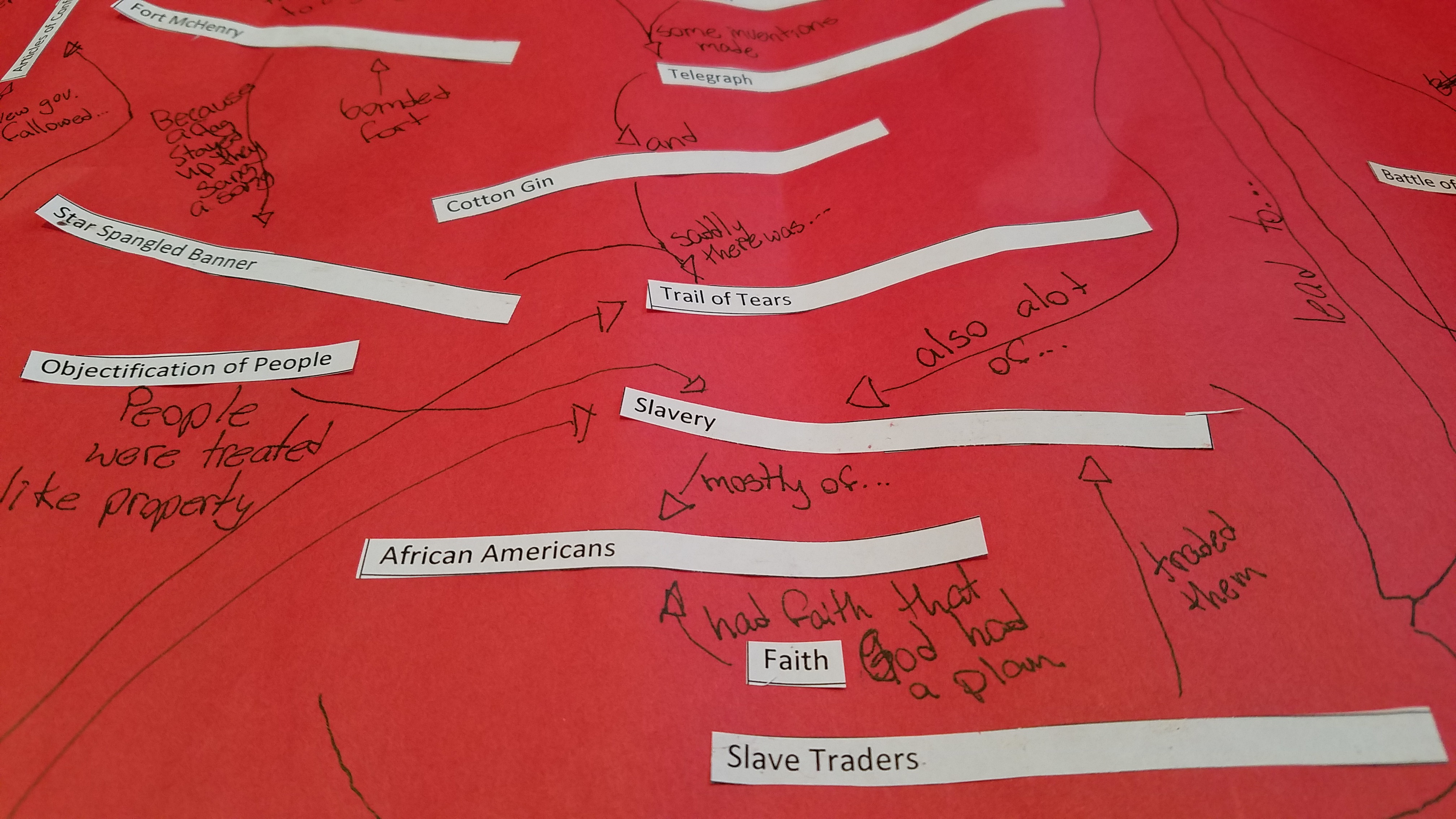 This visual representation of their learning asked students to apply and analyze the information they learned about US history thus far by categorizing, comparing and contrasting, and organizing the terms into chronological order, connecting terms into relationships, and creating larger concept umbrellas. For example, a student should be able to place the term “Gettysburg” after “Yorktown,” connect the two with the word “warfare,” and perhaps further umbrella all three terms with a fourth, such as “faith,” “hope”, “African-Americans,” or “Native Americans,” depending on their train of thought and rationale.